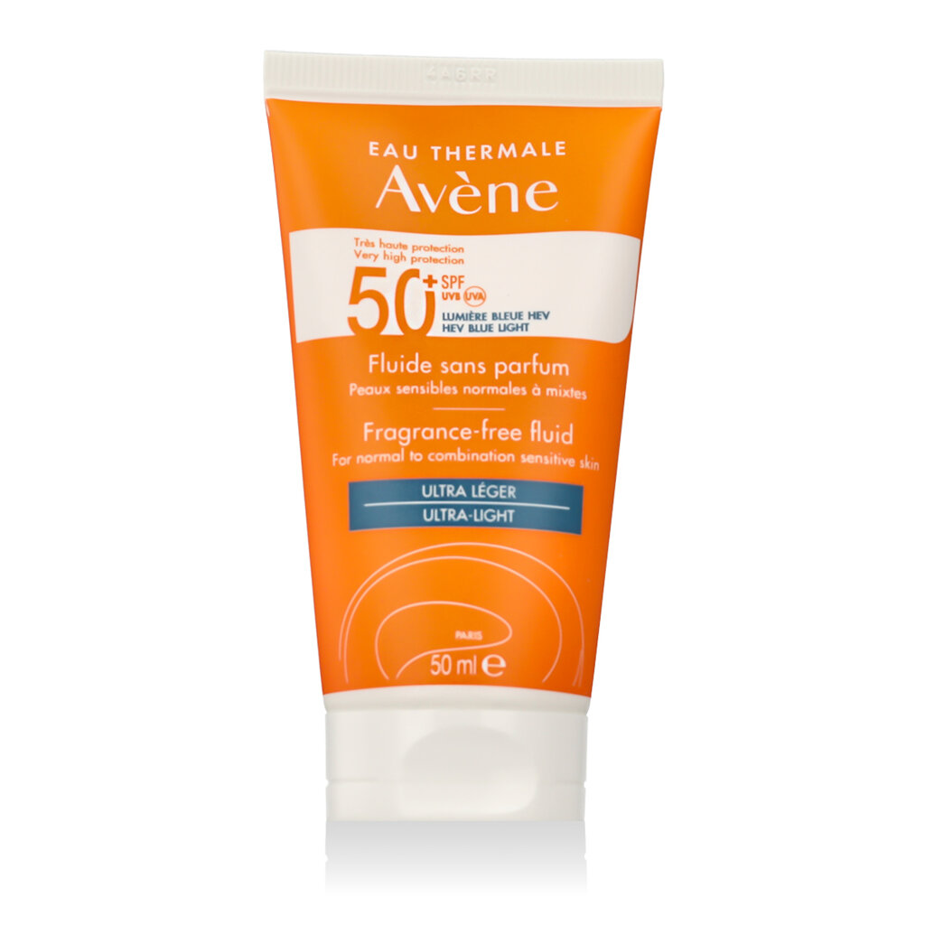 Avène Eau Thermale Fluid SPF 50+ 50 ml to lekki nawilżający fluid do twarzy z bardzo wysoką ochroną przeciwsłoneczną SPF 50+ o szerokim spektrum działania, odpowiedni dla skóry wrażliwej. Dzięki opatentowanemu systemowi filtracji TriAsorB™ chroni nie tylko przed promieniami UVA i UVB, ale także przed światłem niebieskim, które przyspiesza starzenie się skóry. Jego nietłusta i niekomedogenna konsystencja jest idealna do codziennego stosowania.
