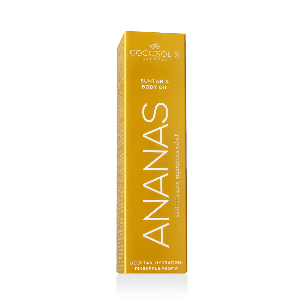 COCOSOLIS ANANAS Suntan & Body Oil 110 ml to egzotycznie pachnący olejek do opalania i ciała, który pomaga uzyskać szybką, intensywną i równomierną opaleniznę, jednocześnie odżywiając i nawilżając skórę. Jest wykonany w 100% z naturalnych i organicznych olejów i jest idealny nie tylko do opalania, ale także jako codzienny olejek do ciała dla miękkiej, elastycznej i zdrowo wyglądającej skóry. Świeży zapach ananasa przywołuje letnią atmosferę przy każdym użyciu.