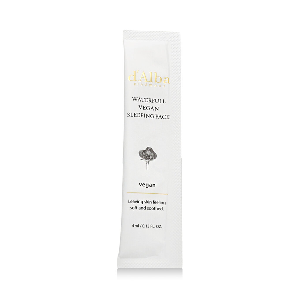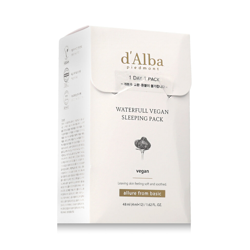 d'Alba Waterfull Vegan Sleeping Pack 12 x 4 ml - lekka, ale intensywnie nawilżająca maseczka na noc, która odbudowuje i rewitalizuje skórę podczas snu. Dzięki formule z białą truflą, niskocząsteczkowym kwasem hialuronowym i ekstraktami roślinnymi zapewnia skórze głębokie nawilżenie, odżywienie i ochronę przed czynnikami zewnętrznymi.