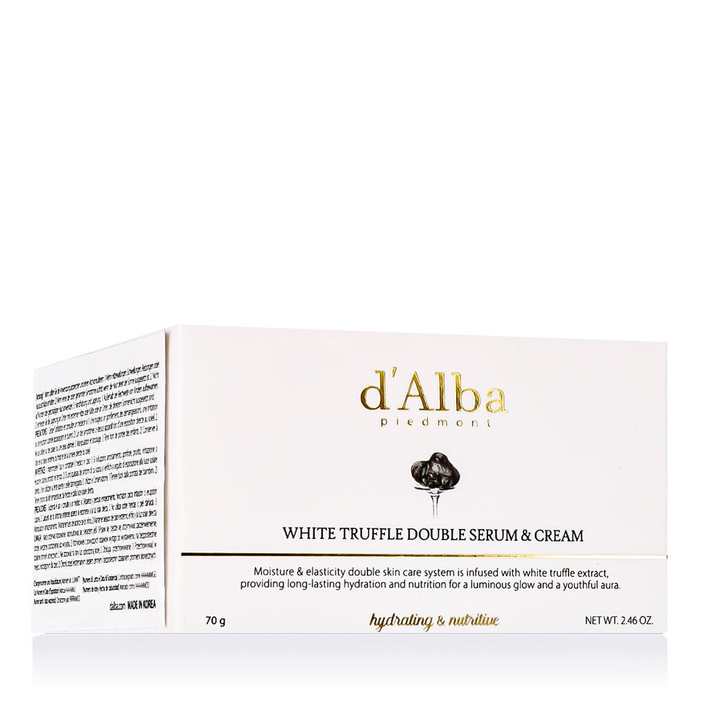 d'Alba White Truffle Double Serum & Cream 70 g - luksusowa dwufazowa kuracja łącząca moc skoncentrowanego serum i bogatego kremu w jednym produkcie.Dzięki unikalnej podzielonej konsystencji umożliwia indywidualną aplikację w zależności od potrzeb skóry - lekkie serum dla intensywnego nawilżenia lub odżywczy krem dla głębszej regeneracji.Głównym składnikiem jest ekstrakt z białej trufli, który jest bogaty w przeciwutleniacze i pomaga rozjaśnić, ujędrnić i chronić skórę przed przedwczesnym starzeniem.