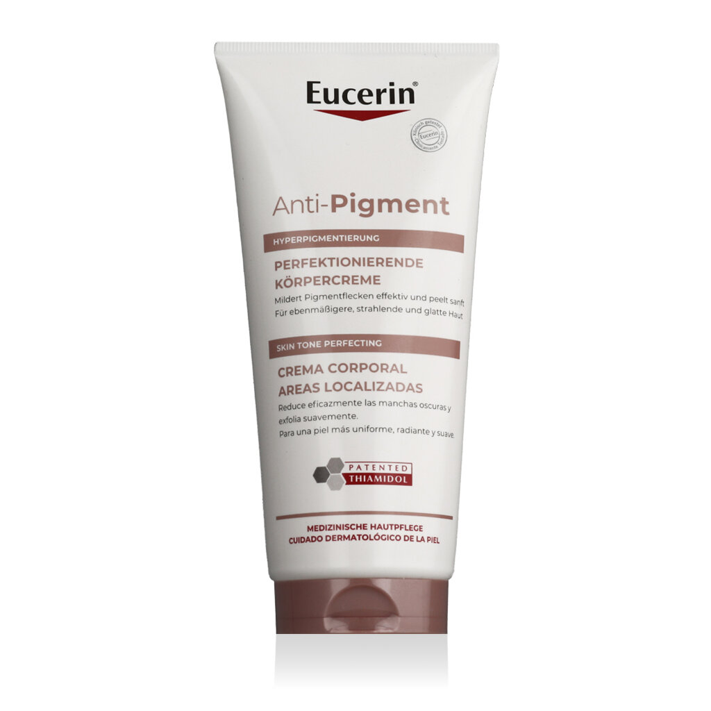 Eucerin Anti-Pigment Body Cream 200 ml to skuteczna kuracja dermatologiczna mająca na celu redukcję ciemnych plam i ujednolicenie kolorytu skóry ciała. Zawiera opatentowany składnik aktywny tiamidol, który celuje w przyczynę przebarwień i pomaga stopniowo rozjaśniać i redukować ich ponowne pojawianie się. Krem również nawilża, odżywia i pozostawia skórę miękką i gładką.