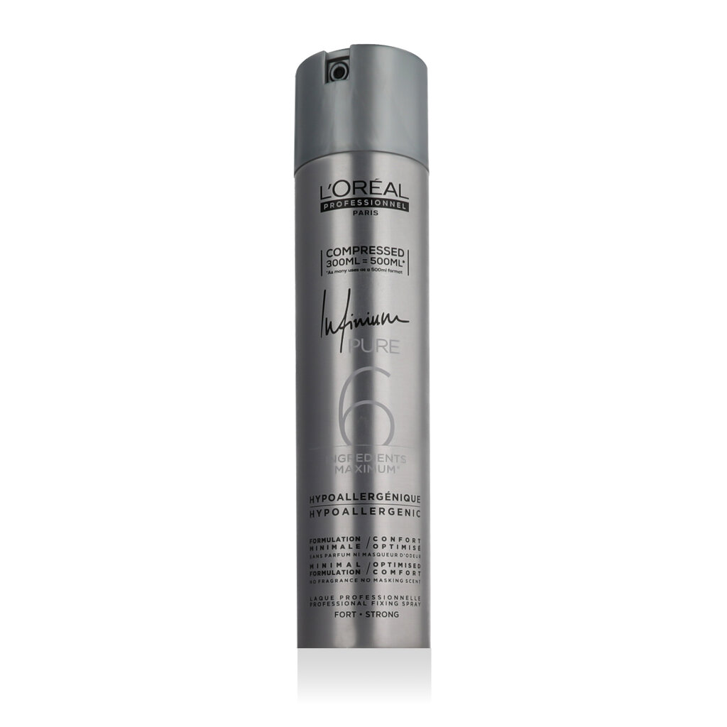 L'Oréal Professionnel Infinium Pure Hairspray Fort Strong 300 ml to profesjonalny lakier do włosów o wyjątkowo mocnym utrwaleniu, który zapewnia długotrwałą kontrolę nad fryzurą, a jednocześnie łatwo się usuwa bez uczucia lepkości. Dzięki "czystej" formule z dużą ilością składników, które szybko się rozprowadzają, zapewnia mocne utrwalenie bez obciążania włosów i pozostawia je naturalnie miękkie w dotyku.