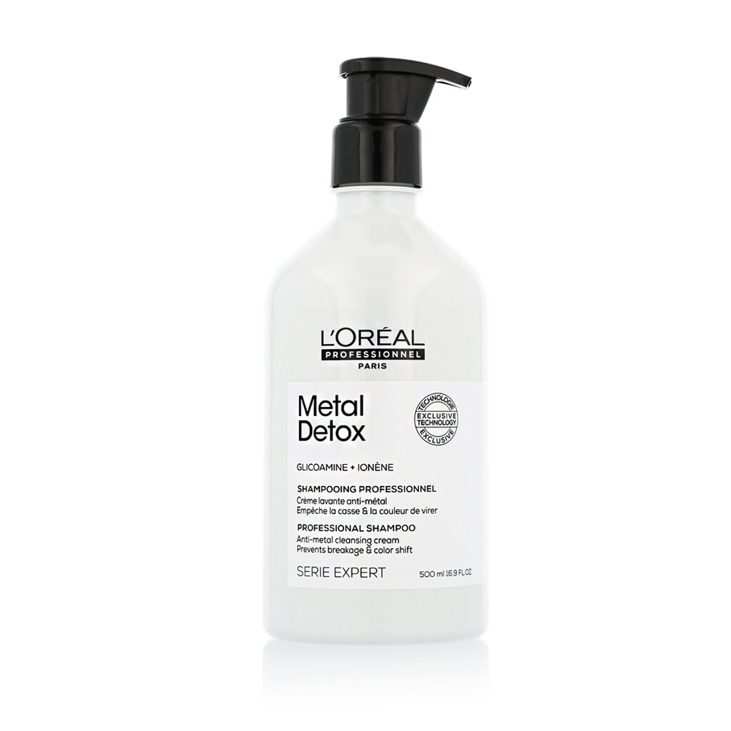 L'Oréal Professionnel Serie Expert Metal Detox Professional Shampoo 500 ml to ochronny szampon oczyszczający przeznaczony do włosów po koloryzacji, rozjaśnianiu lub rozjaśnianiu, aby pomóc usunąć cząsteczki metalu (zwłaszcza miedzi) z włókna włosa. Zawiera opatentowaną cząsteczkę glikoaminę, która chroni włosy przed uszkodzeniami, zapewniając długotrwały kolor i zdrowy wygląd włosów.