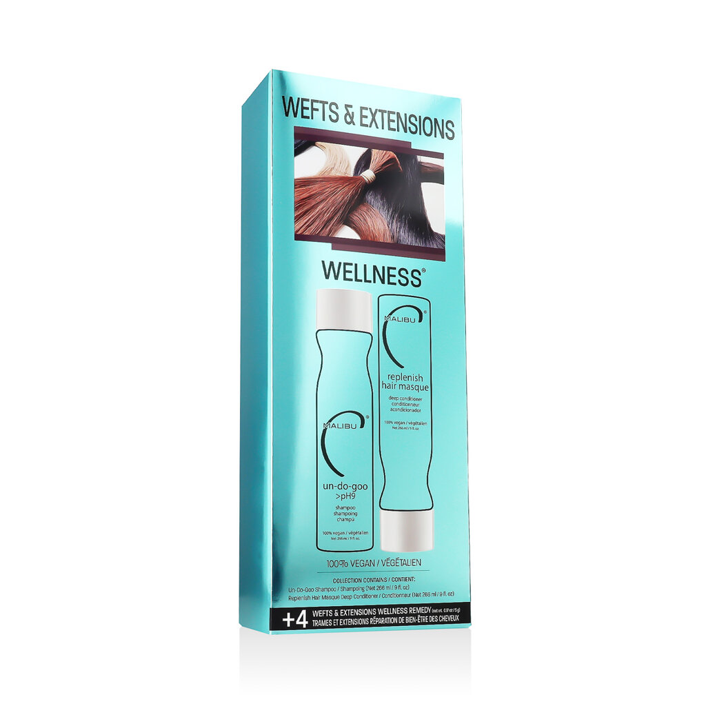 Malibu C Wefts & Extensions Wellness Collection Shampoo 266 ml + Conditioner 266 ml + saszetka 4 x 5 g to specjalistyczny zestaw kosmetyków do włosów przeznaczony do delikatnego, ale dokładnego oczyszczania i pielęgnacji włosów przedłużanych, peruk i tresek. W jego skład wchodzi szampon oczyszczający Un-Do-Goo delikatnie usuwający nagromadzone produkty i pozostałości po środkach chemicznych, odżywcza maska Replenish Hair Masque zapewniająca intensywną regenerację oraz cztery dawki kuracji do włosów w poręcznych saszetkach. Zestaw respektuje strukturę zarówno syntetycznych, jak i ludzkich włosów i jest wolny od agresywnych składników, które mogłyby zagrozić wiązaniu lub integralności przedłużeń.