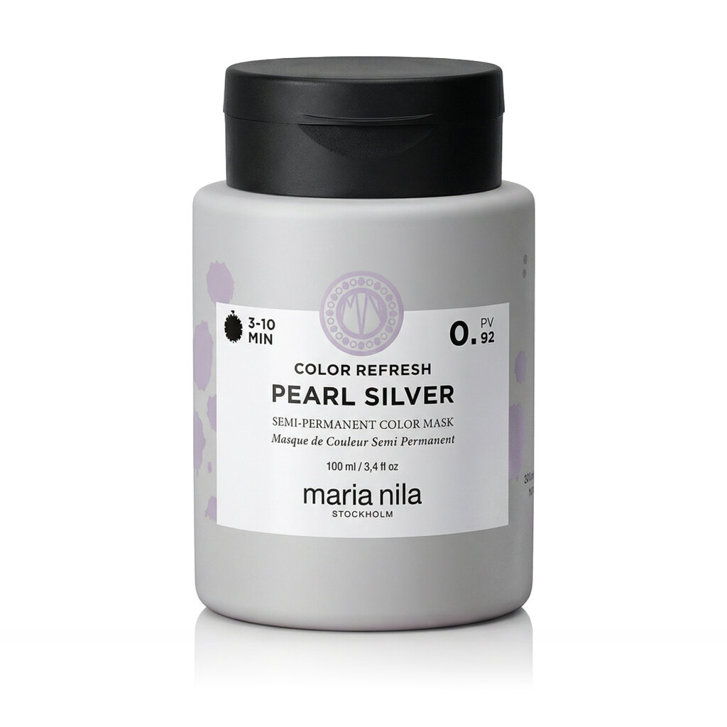 Maria Nila Colour Refresh Semi-permanent Hair Mask with Colour Pigments Pearl Silver 100 ml to barwiona półtrwała maska do włosów, która nadaje włosom chłodny, srebrzysto-perłowy odcień, idealny do neutralizacji żółtych tonów na jasnych, siwych lub blond włosach. Zapewnia również intensywne nawilżenie, miękkość i połysk, bez obciążania i trwałego odbarwiania włókna włosa.