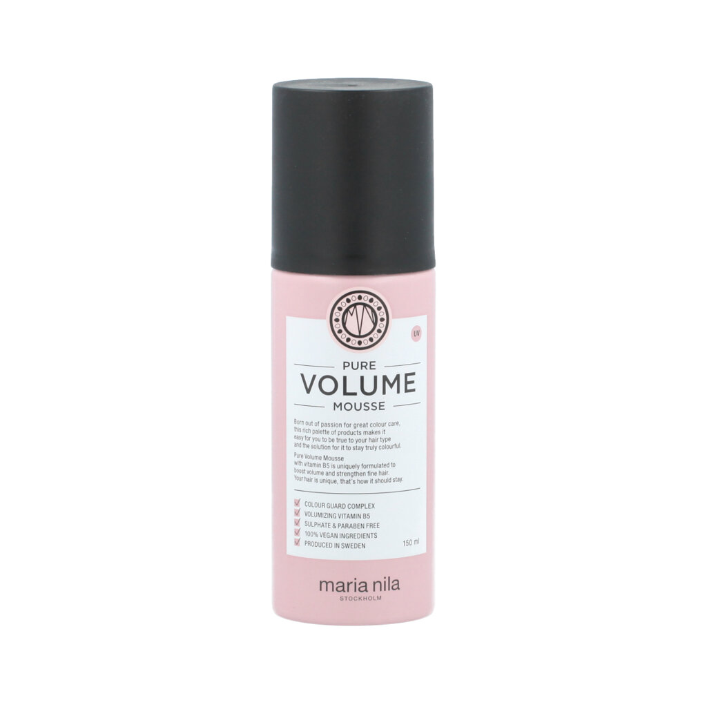 Maria Nila Pure Volume Mousse 150 ml to lekka pianka zwiększająca objętość, która nadaje cienkim włosom siłę, objętość i naturalną teksturę bez ich obciążania. Dzięki zawartości witaminy B5 wzmacnia strukturę włosów, poprawia ich elastyczność i zapewnia długotrwały efekt. Color Guard Complex chroni kolor włosów przed promieniami UV i wolnymi rodnikami, przyczyniając się do zdrowego i promiennego wyglądu.