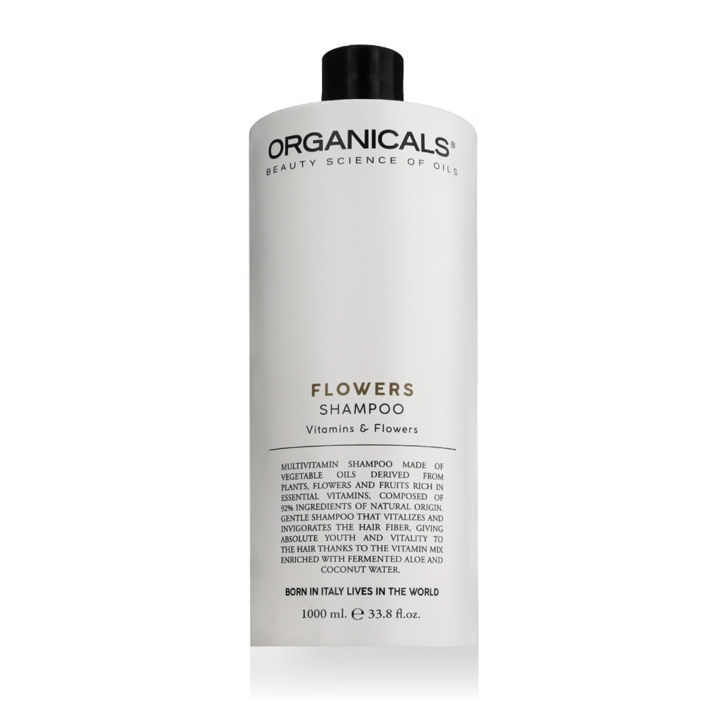 Organicals® FLOWERS Shampoo - delikatny kwiatowy szampon do codziennej pielęgnacji włosów w dużym opakowaniu 1000 ml przeznaczony jest do włosów normalnych, suchych lub zniszczonych, które wymagają delikatnego mycia i jednoczesnego odżywienia. Zawiera naturalne ekstrakty roślinne i esencje kwiatowe, które oczyszczają włosy bez ich obciążania, nadając im połysk, miękkość i przyjemny zapach. Dzięki delikatnej formule bez siarczanów i parabenów nadaje się również do wrażliwej skóry głowy.