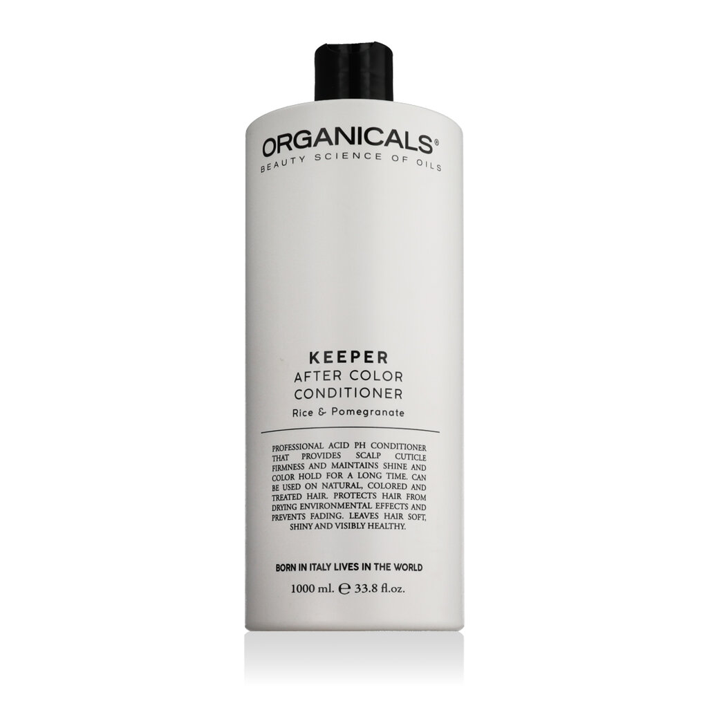 Organicals® KEEPER After Color Conditioner - Odżywka do włosów farbowanych w dużym opakowaniu 1000 ml została opracowana z myślą o potrzebach włosów poddawanych zabiegom chemicznym i farbowanych, zapewniając długotrwałą ochronę koloru, odżywienie i miękkość. Zawiera naturalne ekstrakty i składniki odbudowujące, które pomagają uszczelnić włókno włosa po koloryzacji, łagodzą skórę głowy i zachowują intensywność koloru.