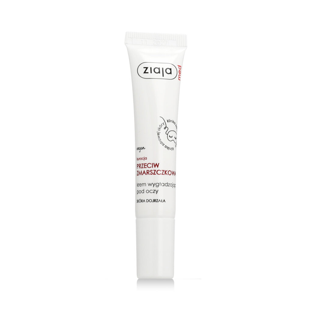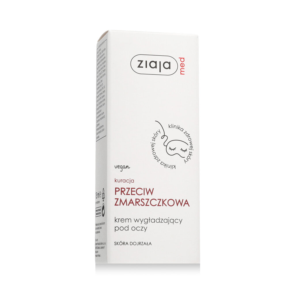 Ziaja Med Kuracja Przeciwzmarszczkowa Wygładzający krem pod oczy 15 ml - Przeciwzmarszczkowy krem pod oczy to ukierunkowana kuracja dla dojrzałej i wrażliwej skóry wokół oczu, która potrzebuje wygładzenia drobnych zmarszczek, nawilżenia i wzmocnienia elastyczności skóry. Krem zawiera koenzym Q10, kwas hialuronowy i prowitaminę B5, które współpracują ze sobą, aby promować regenerację, jędrność i młodzieńczy wygląd w tym wrażliwym obszarze.